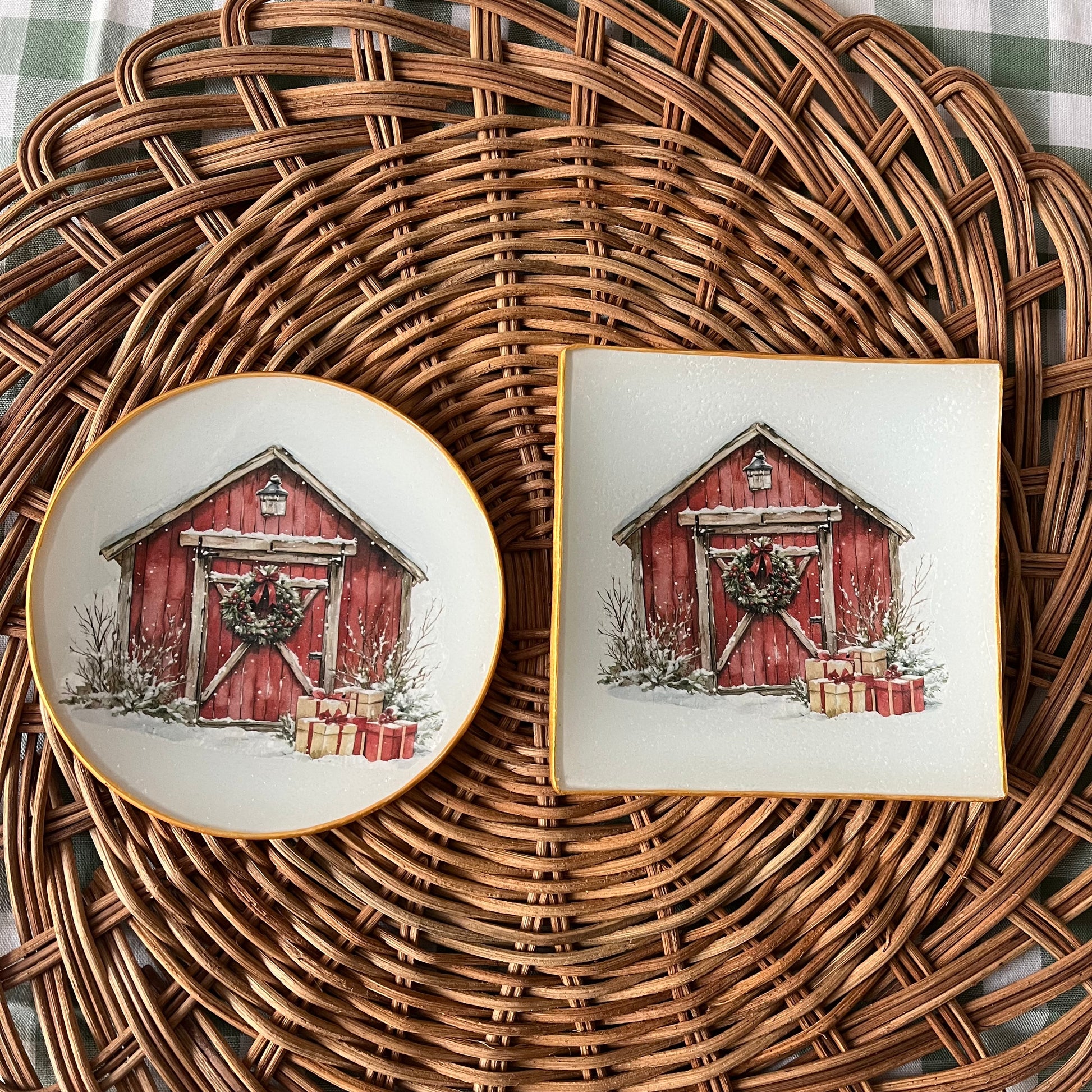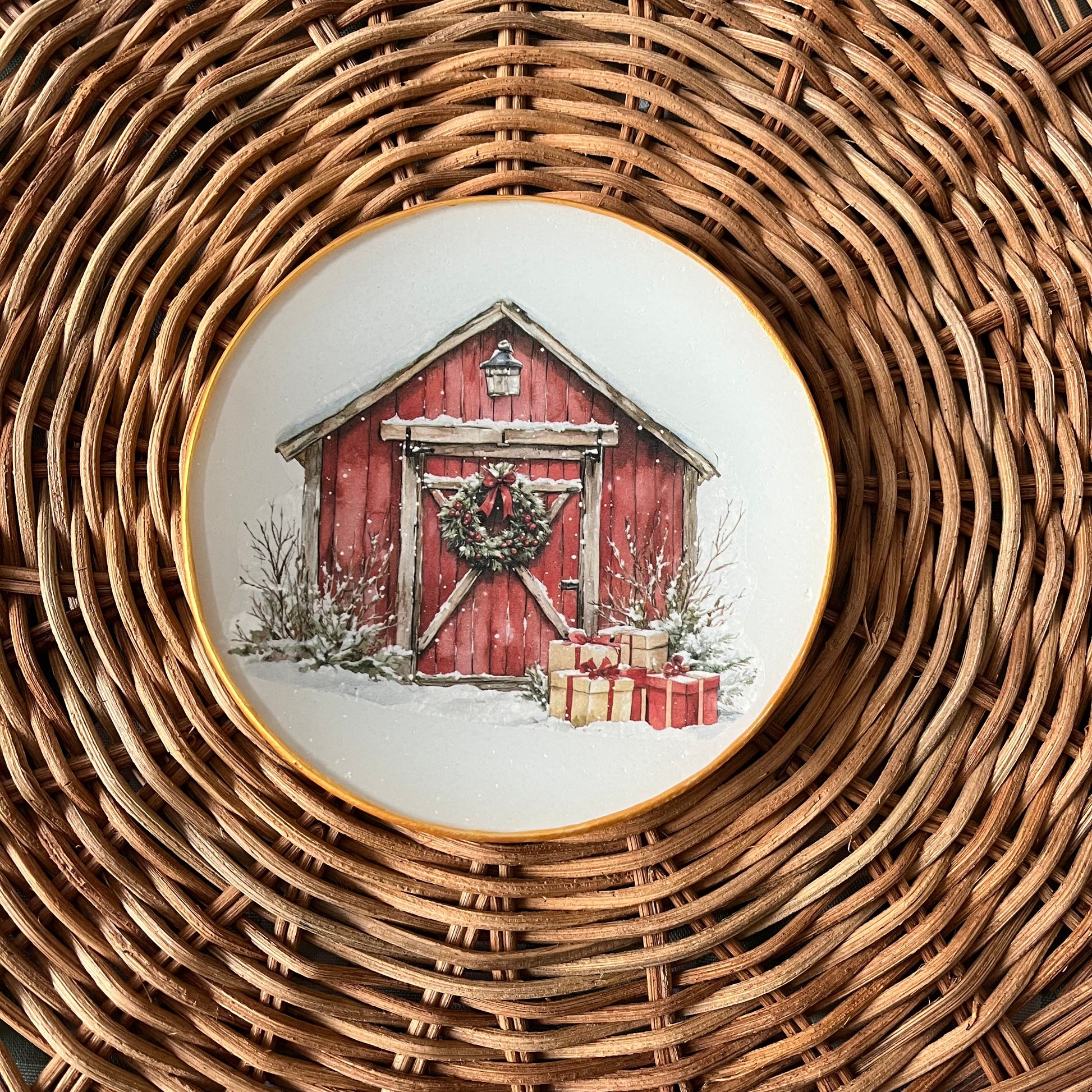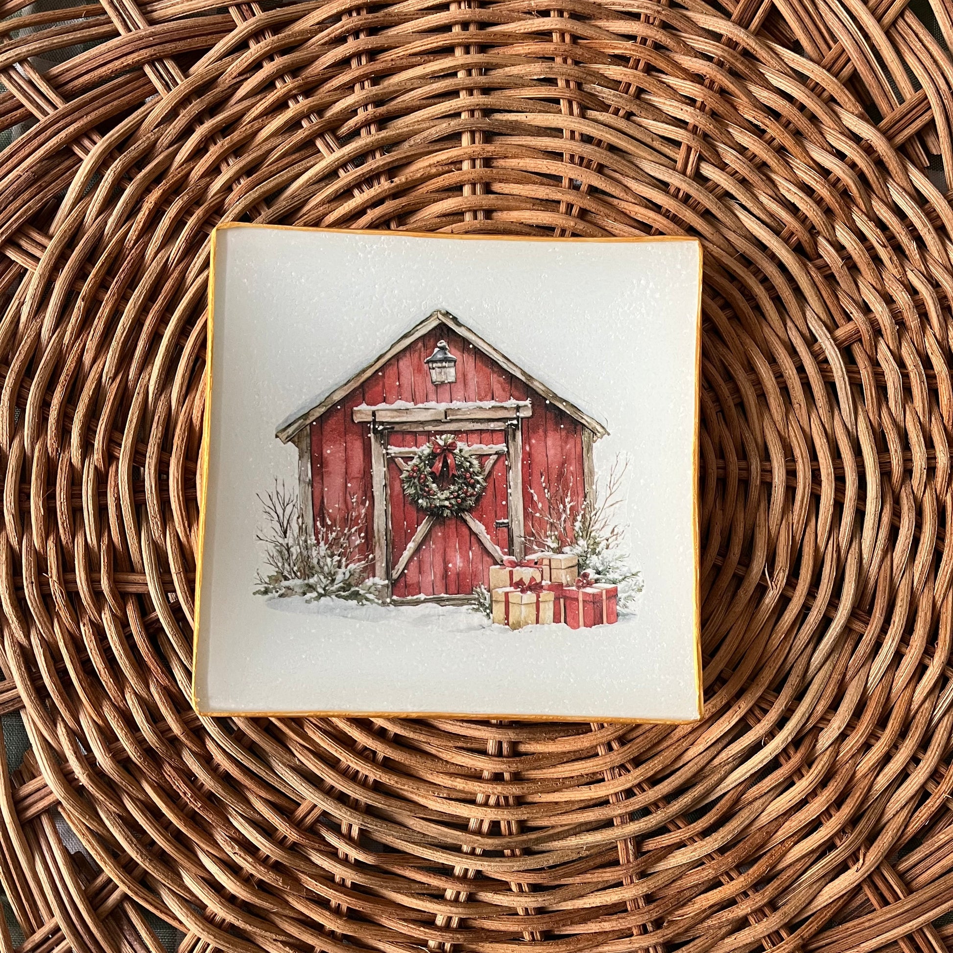 Plato de cristal decorado con la técnica decoupage.