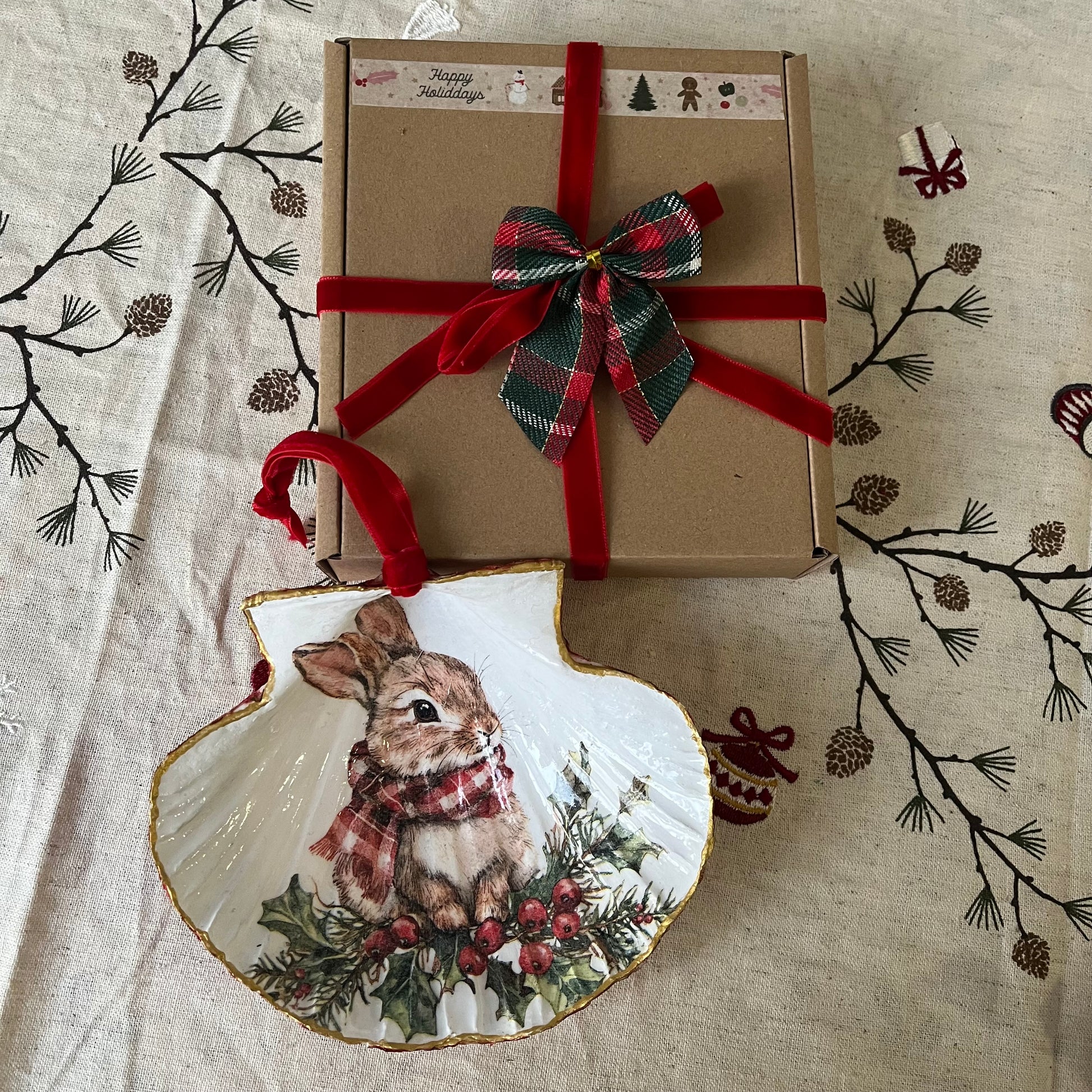 Envoltorio de regalo para conchas de vieira con motivos navideños.